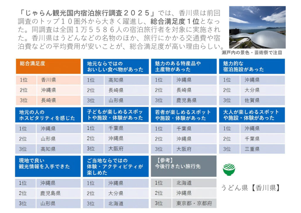 知っていました?現在、地域振興に力を入れている香川県は、じゃらん観光国内宿泊旅行調査 2025【都道府県魅力度ランキング編】において総合満足度1位という調査結果なんです。