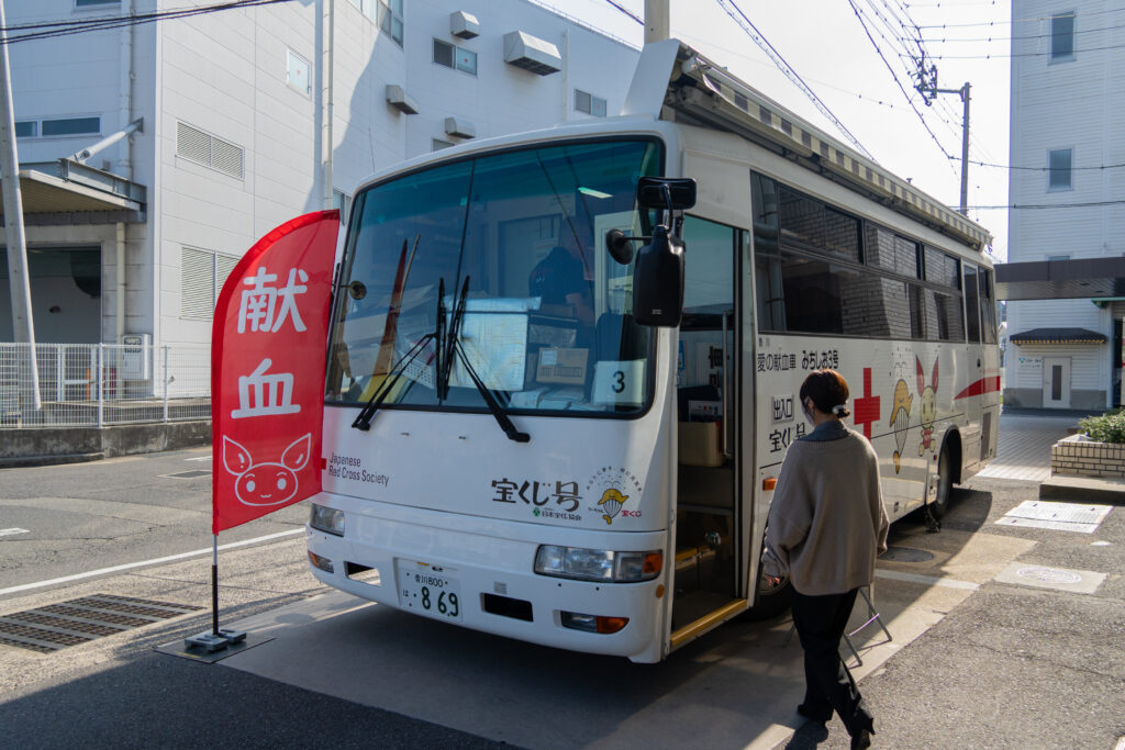 11月14日、ホテルリネン工場前にて日本赤十字社・香川県赤十字血液センターの献血バスによる社内献血を実施しました。